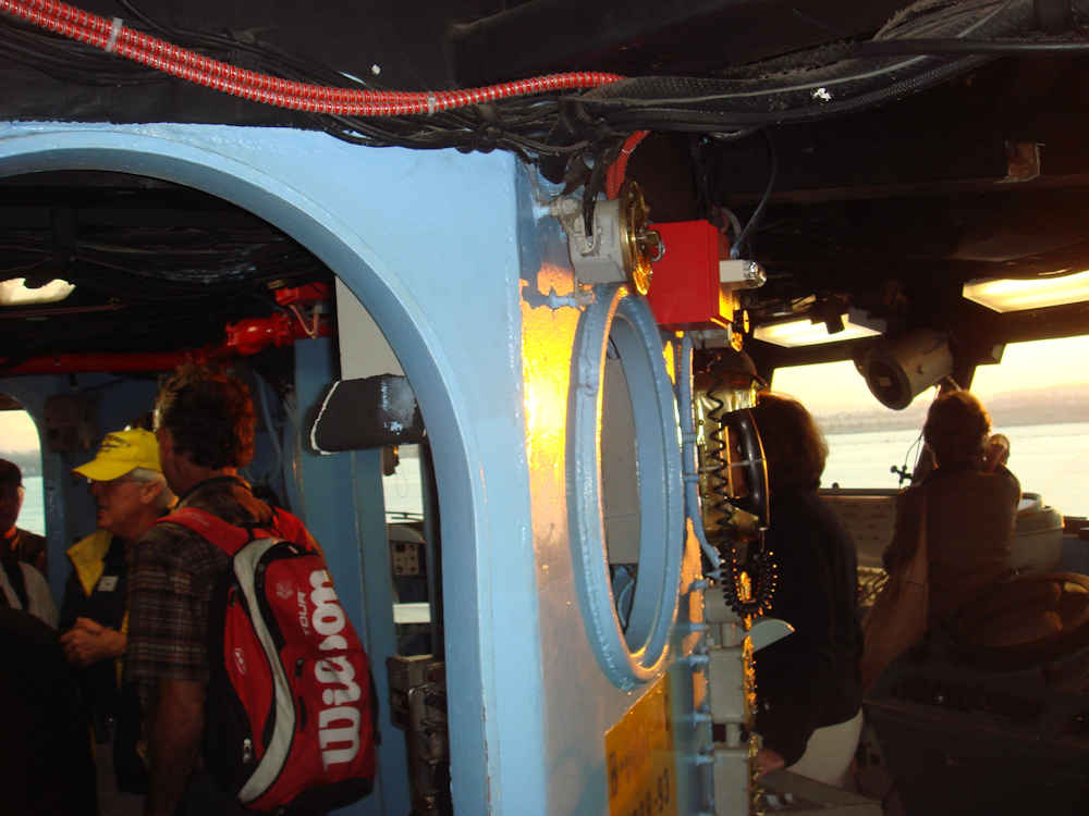 艦橋の見学ツアーもありました。黄色い帽子のおじさんは、案内役の退役軍人さんです。艦橋内部の様子や光学着艦装置の説明をしてくれました。